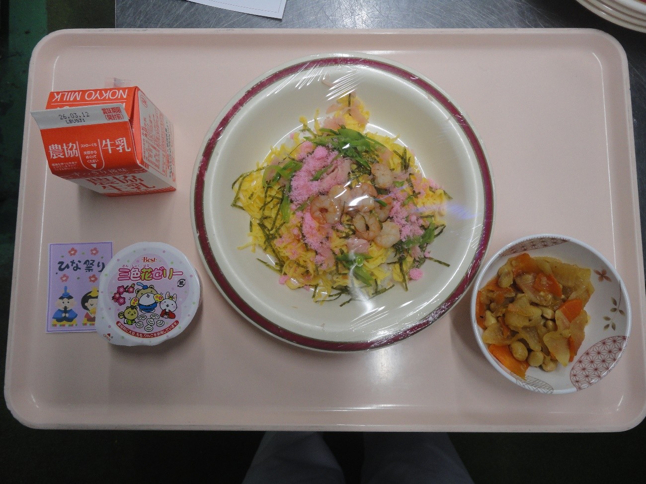 今年のひな祭りは、ちらし寿司、きんぴら、三色花ゼリーを提供しました。